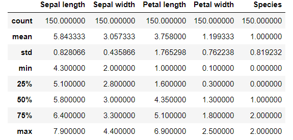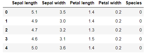 import pandas as pddf = pd.read_csv('iris.csv')df.columns = ['Sepal length', 'Sepal width', 'Petal length', 'Petal width', 'Species']
