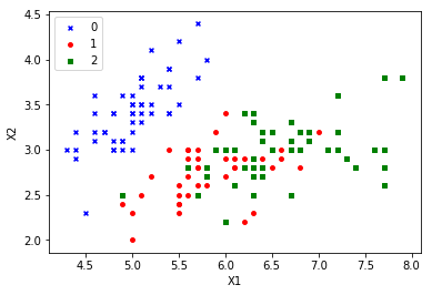plt.xlabel('X1')plt.ylabel('X2')plt.legend(loc = 'upper left')