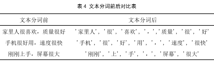 本文借助Python的jieba分词包,对小米手机商品评论数据做中文分词处理。研究表明,使用Python的jieba分词包,其分词精度达到97%以上,分词效果明显,本文文本分词前后对比如下表所示。