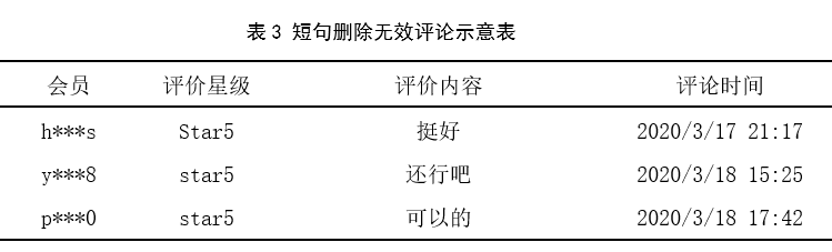 本文首先统计每一条文本评论数据的长度,通过计算每一条文本评论数据的长度,筛选长度大于4的文本评论数据,实现短文本评论数据的删除,短句删除无效的评论数据如下表所示: