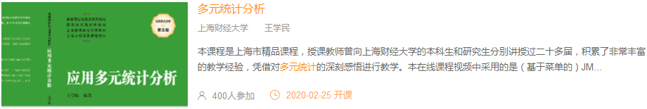 本课程是上海市精品课程,授课教师曾向上海财经大学的本科生和研究生分别讲授过二十多届,积累了非常丰富的教学经验,凭借对多元统计的深刻感悟进行教学。本在线课程视频中采用的是(基于菜单的)JMP软件;此外,R语言的代码和SPSS软件的应用等可在每附录下载文件,而SAS软件的应用可见本课程教材。