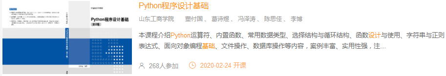 本课程介绍Python运算符、内置函数、常用数据类型、选择结构与循环结构、函数设计与使用、字符串与正则表达式、面向对象编程基础、文件操作、数据库操作等内容,案例丰富、实用性强,注重Python内功修炼。通过本课程的学习,大家会对Python有更深入的了解,能够编写优雅的代码解决自己专业中的问题。
