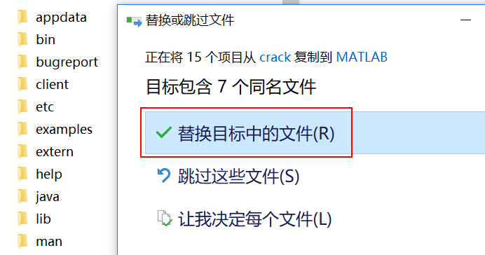 第二步,粘贴这三个文件夹到安装的路径下MATLAB,选择覆盖并替换。