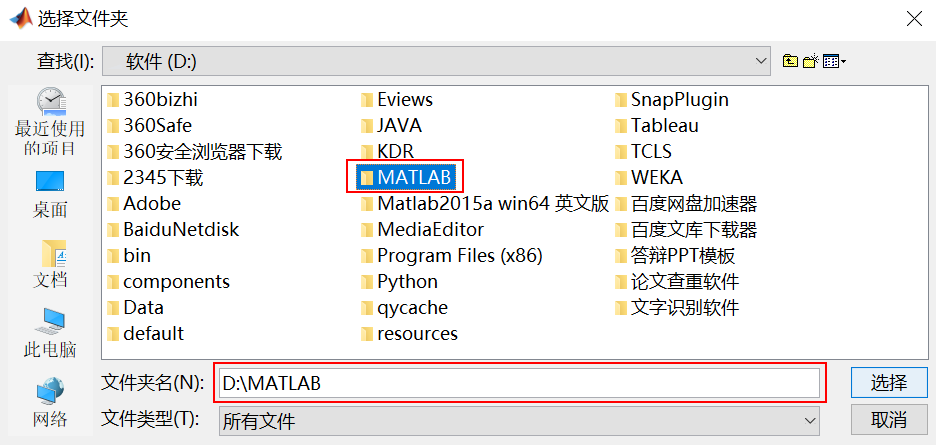 第七步,选择安装路径,找到刚开始新建的MATLAB文件夹。