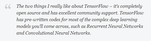 我喜欢TensorFlow的原因有两点:它完全是开源的,并且有出色的社区支持。TensorFlow为大多数复杂的深度学习模型预先编写好了代码,比如递归神经网络和卷积神经网络。