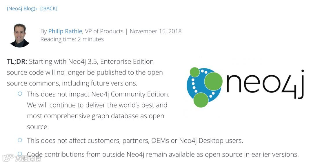 Neo4j 是非常流行的图 数据库,在11月初刚刚宣布完成 E 轮 8000 万美元融资。此次调整,也意味着 Neo4j 选择了转向更为常见的 open core 许可模式。Neo4j 平台的核心 —— Neo4j 社区版,将继续在 GPLv3 许可下开源。Neo4j 企业版,原来也有大部分的源代码以 AGPLv3 许可开源(今年5月份有变更为 AGPLv3 + Commons Clause 双重许可),从 Neo4j 3.5 GA 版本开始,仅用于企业版的代码将不再开源。