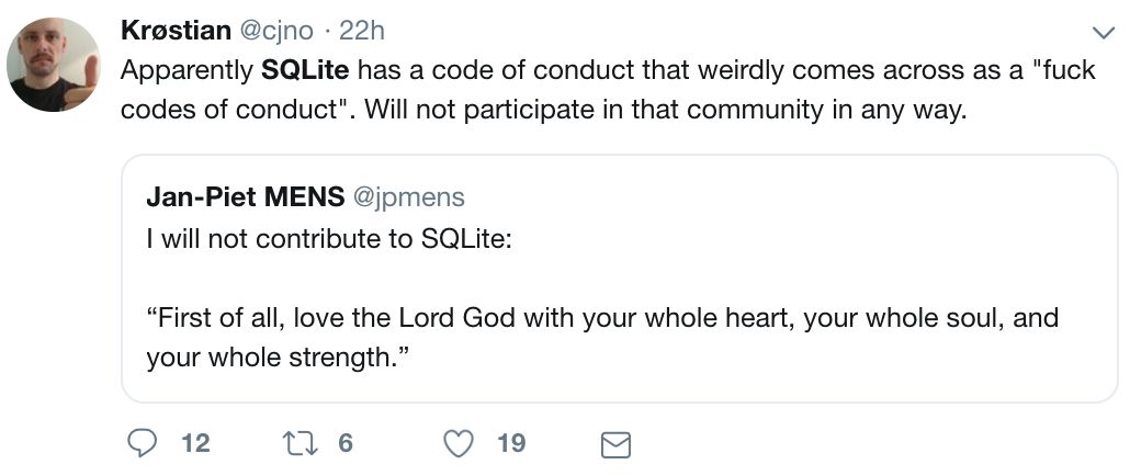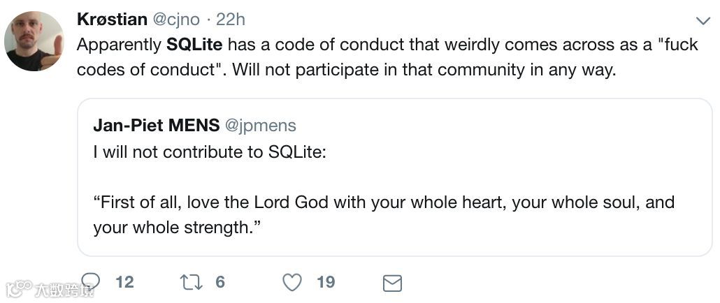 距离 Linux 社区因采用 COC 行为准则而被贡献者威胁要撤销代码的事件不到一个月,关系数据库管理系统 SQLite 昨日也因为其社区行为准则而被许多用户批判和吐槽,甚至表示不会再以任何方式参与该社区。