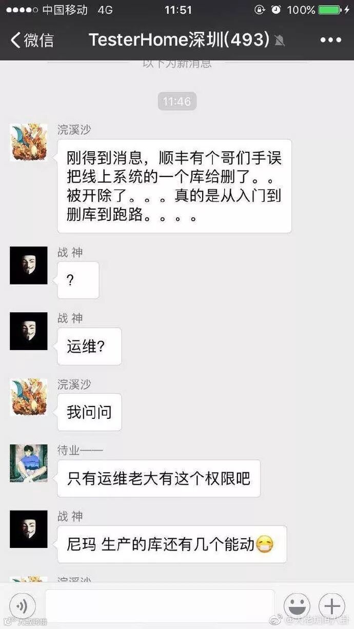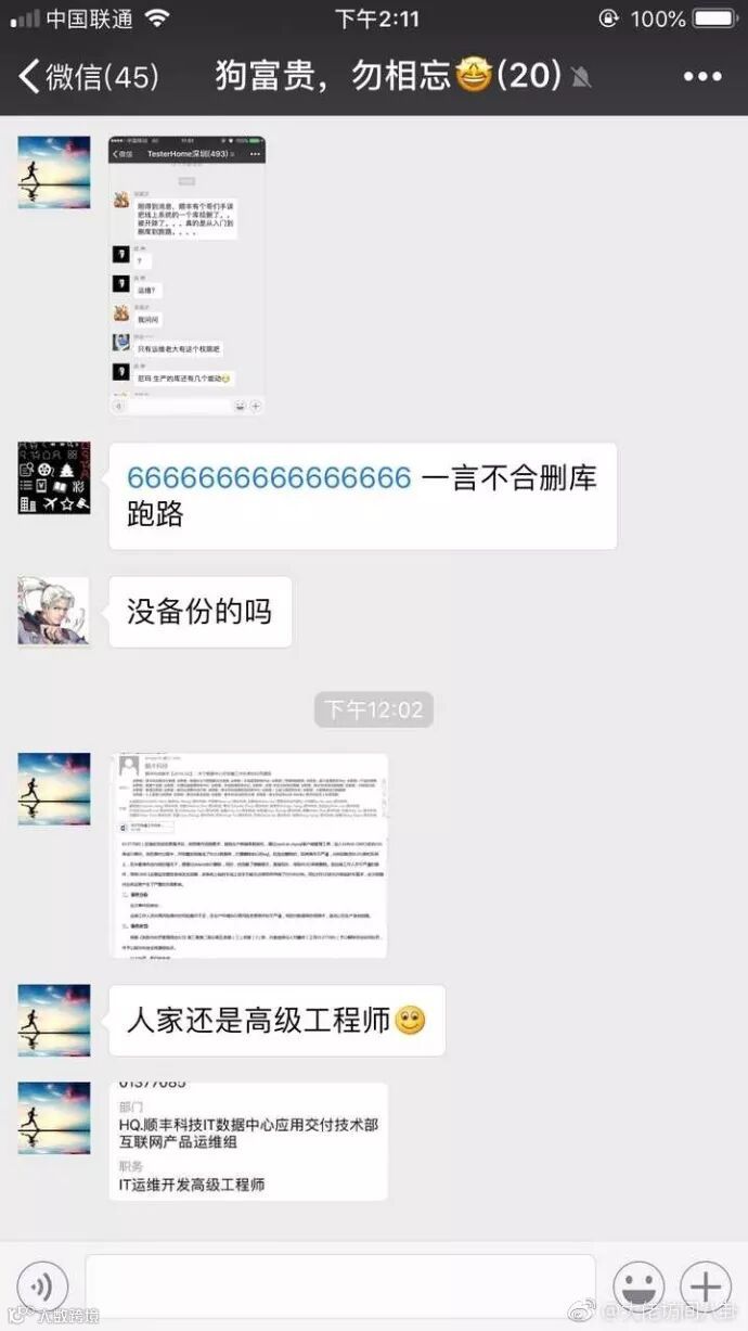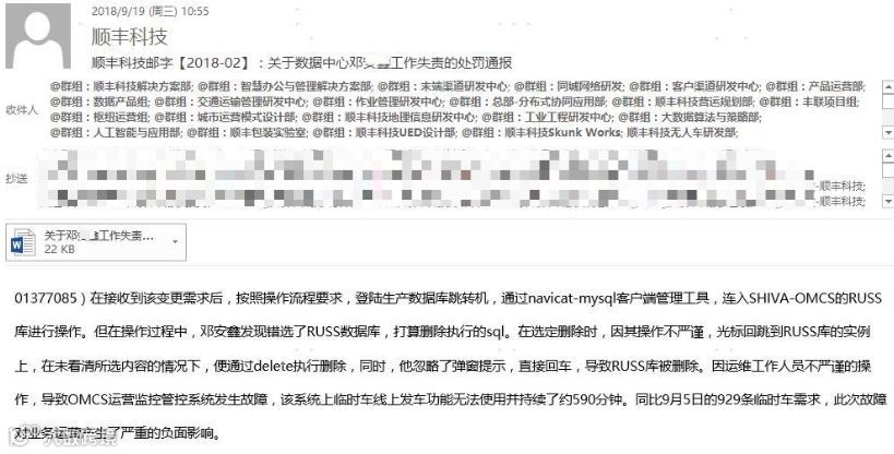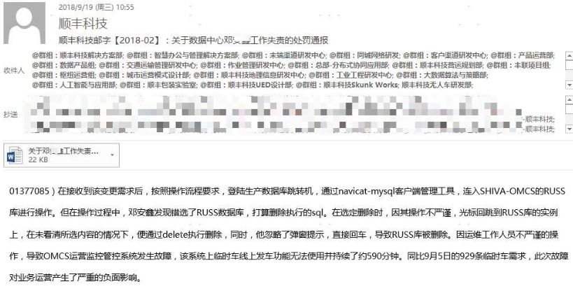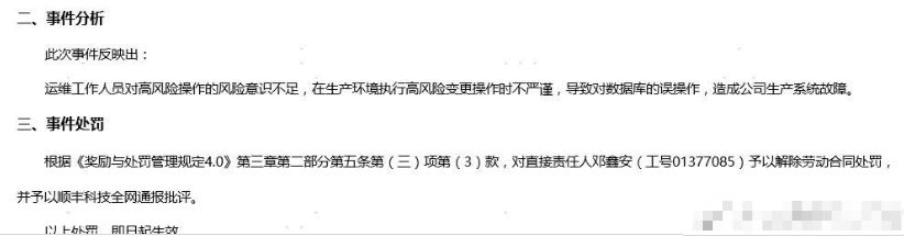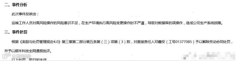 9 月 19 日,微博网友大佬坊间八卦爆料,顺丰科技数据中心的一位高级工程师(邓XX)误删生产数据库,导致某项服务无法使用并持续 590 分钟。顺丰根据公司相关规定,辞退工程师邓某,并在顺丰内网通报。