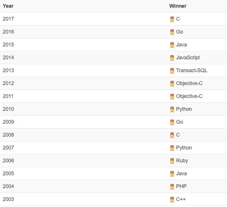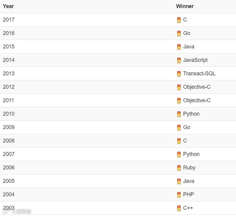 历届“年度编程语言”获奖名单如下图所示,该奖项授予一年中评分最高的编程语言: