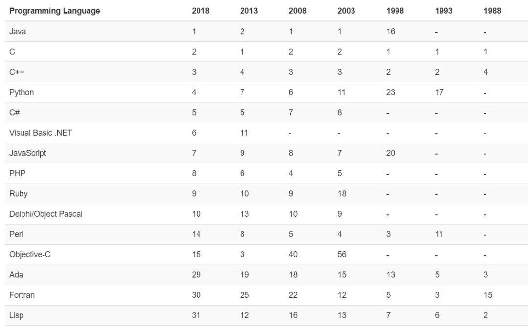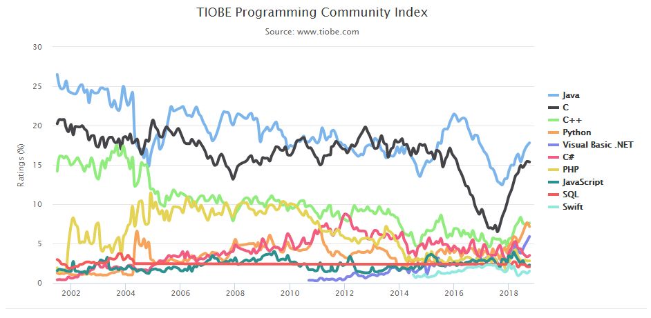 TOP 10 编程语言 TIOBE 指数走势(2002-2018)