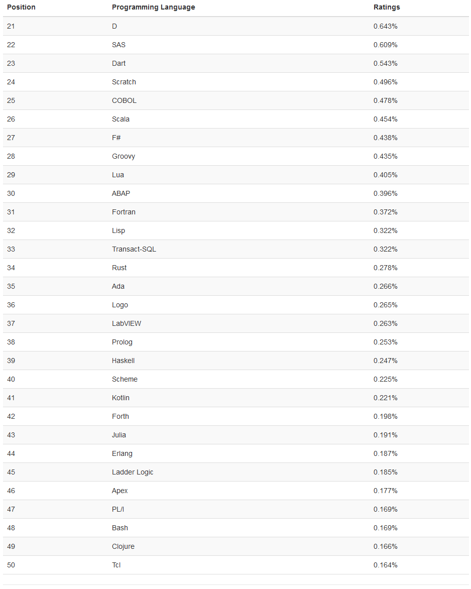 其他方面,备受大家关注并被寄予众望的 Rust 在 10 月的排名中出现了轻微的下滑,由上个月的 31 名跌到了这个月的 34 名。