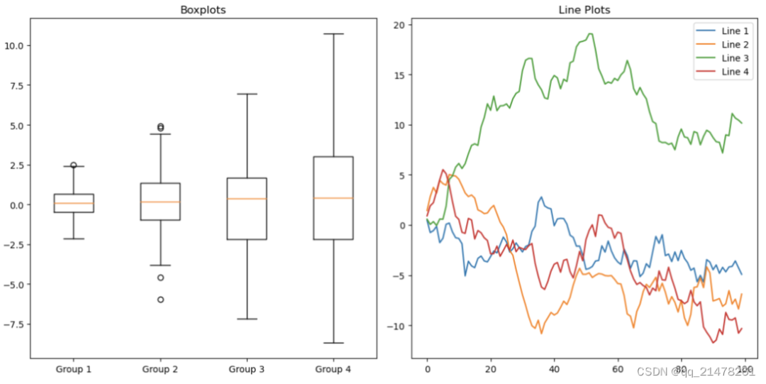 data_lineplot = [np.cumsum(np.random.randn(100)) for _ in range(4)]