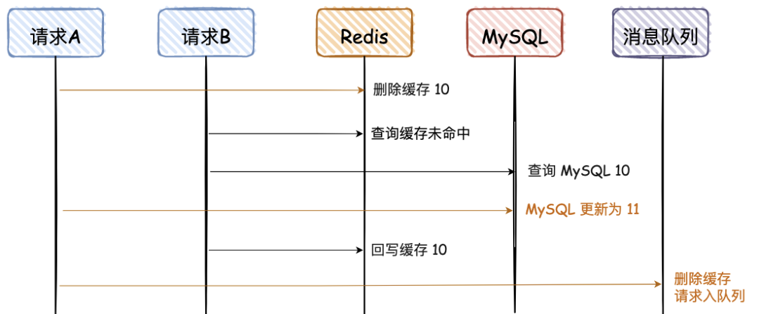 这是一副时序图,描述请求的先后调用顺序; 橘黄色的线是请求 A,黑色的线是请求 B; 橘黄色的文字,是 MySQL 和 Redis 最终不一致的数据; 数据是从 10 更新为 11; 后面所有的图,都是这个含义,不再赘述。