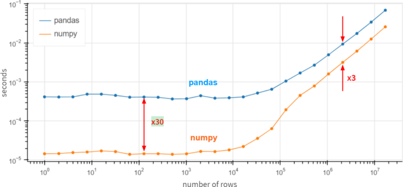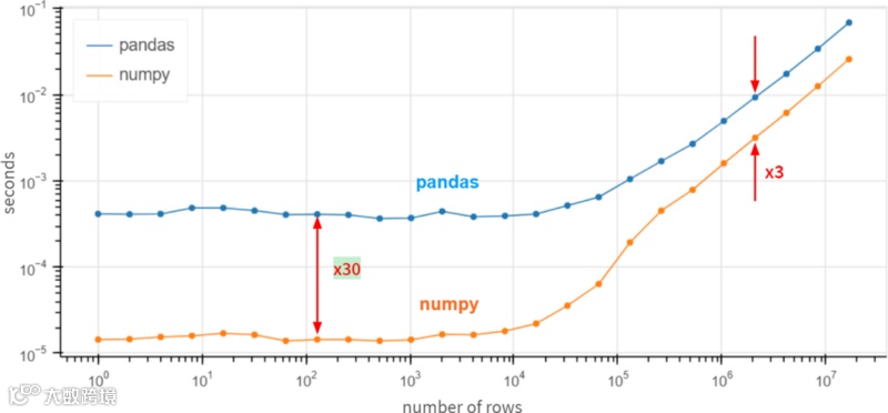 对于小数组(少于100行),Pandas似乎比NumPy慢30倍,对于大数组(超过100万行)则慢3倍。