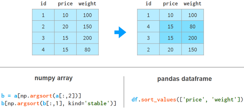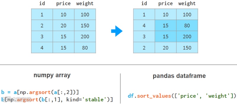在NumPy中,我们先按重量排序,然后再按价格排序。稳定排序算法保证第一次排序的结果不会在第二次排序期间丢失。NumPy还有其他实现方法,但没有一种方法像Pandas那样简单优雅。