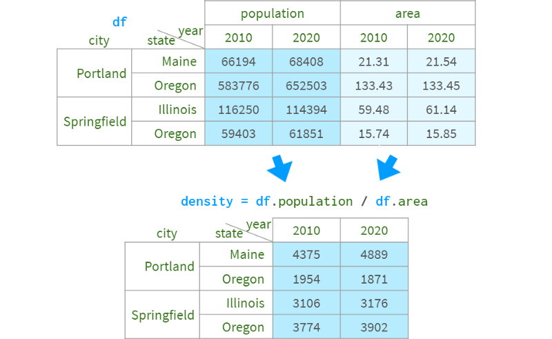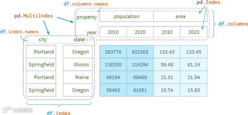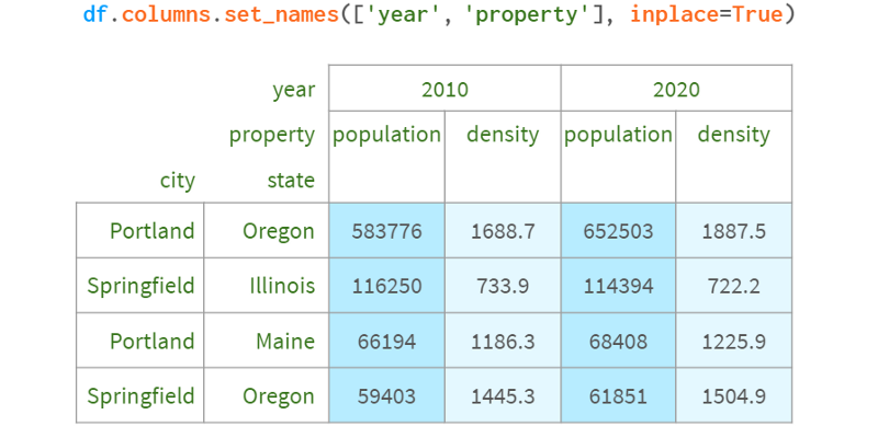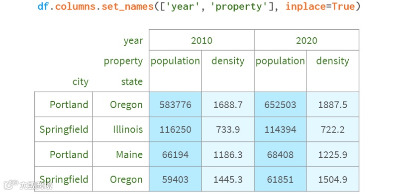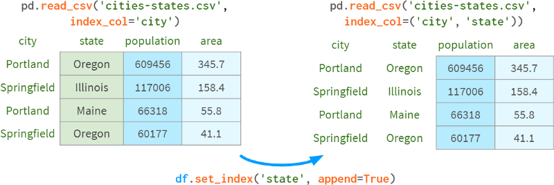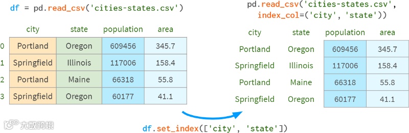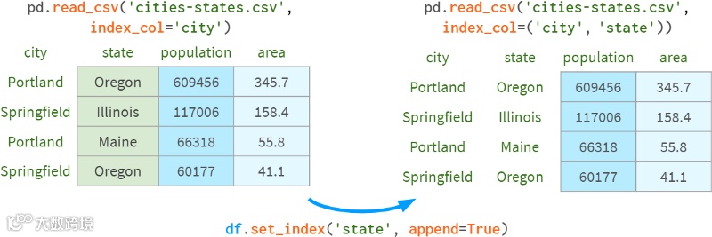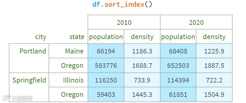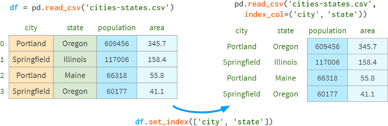 有时,一列不足以唯一标识一行。例如,同一个名字的城市有时会碰巧出现在不同的国家,甚至是同一个国家的不同地区。所以(城市,州)是一个比城市更好的标识一个地方的候选者。在数据库中,这被称为“复合主键”。在Pandas中,它被称为多索引(参见下面的第4部分),索引中的每一列都被称为“级别”。