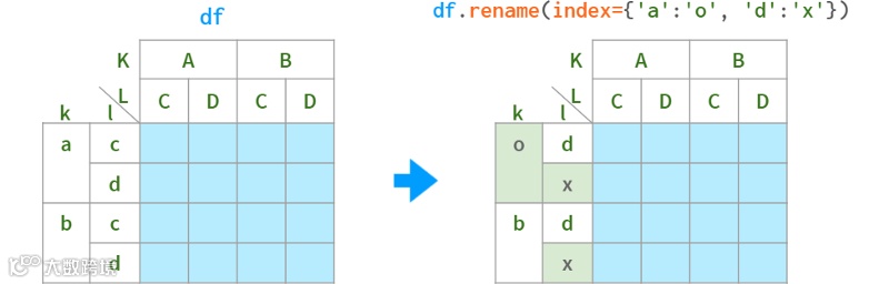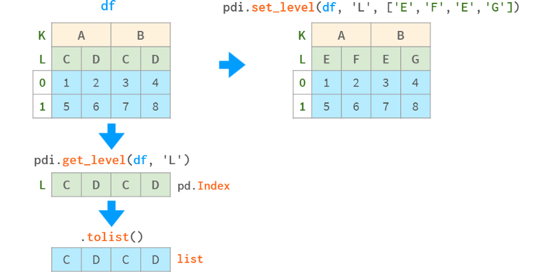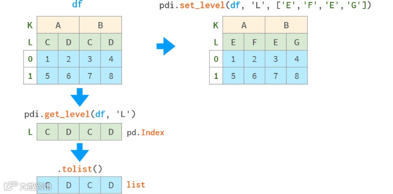 pdi.set_level(obj, level_id, labels)用给定的数组(list, NumPy array, Series, Index等)替换关卡的标签