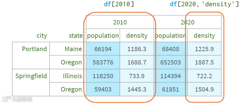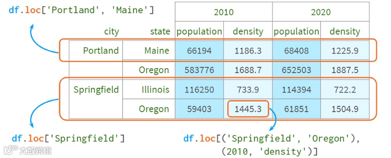 这种语法唯一的缺点是,当你使用两个索引器时,它返回一个副本,所以你不能写df.mi[:, ' Oregon ']。Co [' population '] = 10。有许多可选的索引器,其中一些允许这样的赋值,但它们都有自己的特点: