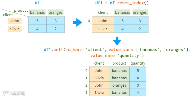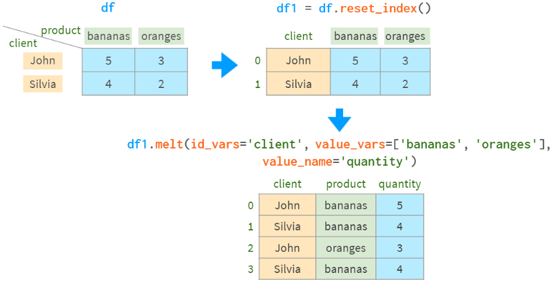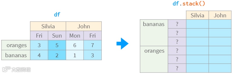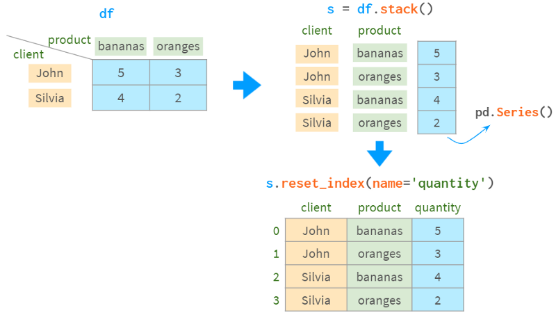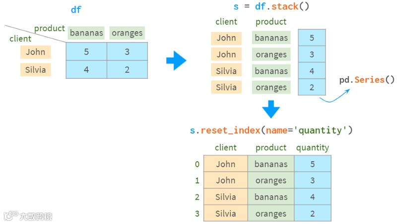 “该函数的命名类似于重新组织的书籍集合,从水平位置并排(dataframe的列)到垂直堆叠(在dataframe的索引中)。”