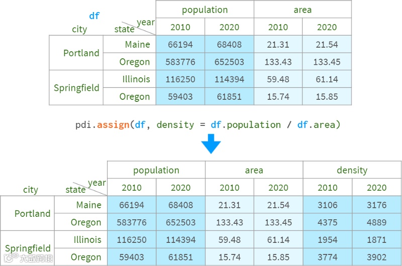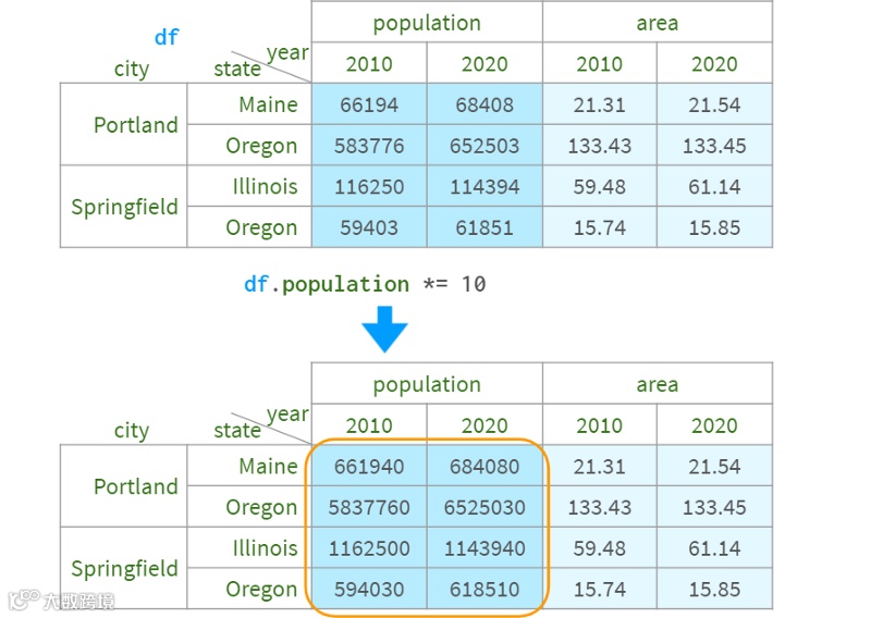 如果想保持原始数据不变,可以使用df1 = df.assign(population=df.population*10)。