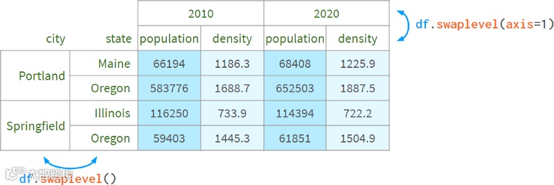 因此,df[:, 'population']可以用df.swaplevel(axis=1)['population']实现。
