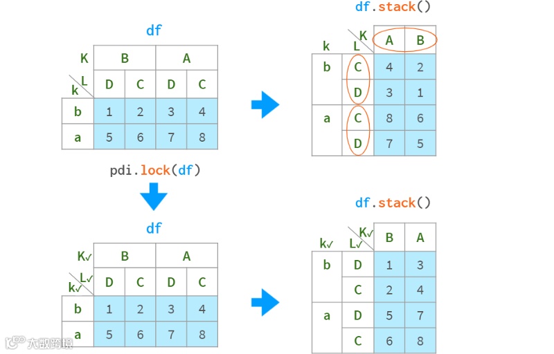 pdi.assign是锁定顺序感知的,所以如果你给它一个(多个)锁定级别的dataframe,它不会解锁它们或后续的栈/解栈/等。操作将保持原始的列和行顺序。