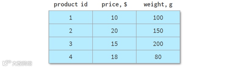 它描述了一个在线商店的不同产品线,共有四种不同的产品。与前面的例子不同,它可以用NumPy数组或Pandas DataFrame表示。但让我们看一下它的一些常见操作。