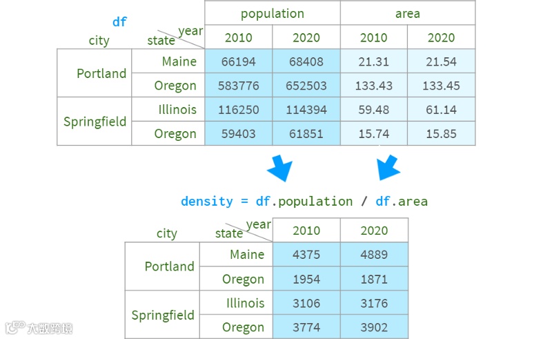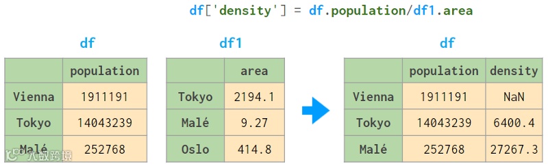 你也可以用density=df.population/df.area轻松获得人口密度。