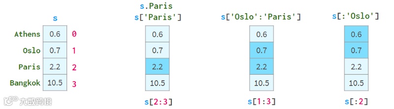 使用方括号而不是圆括号的目的是为了访问Python的切片约定:你可以使用单个或双冒号,其含义是熟悉的start:stop:step。像往常一样,缺少开始(结束)意味着从序列的开始(到结束)。step参数允许使用s.iloc[::2]引用偶数行,并使用s['Paris':'Oslo':-1]以相反的顺序获取元素。