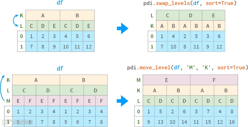 pdi.swap_levels (obj, src=-2, dst=-1)交换两个级别(默认是两个最内层的级别)