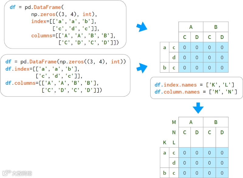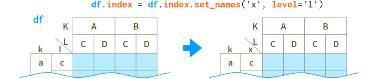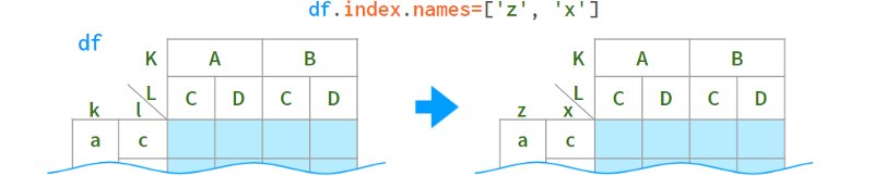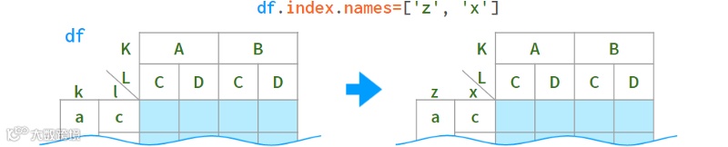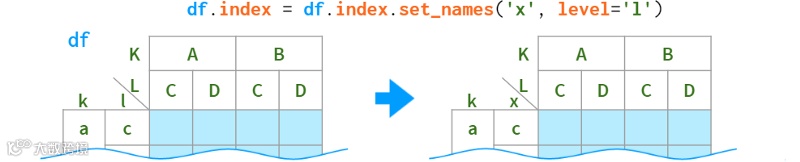 至于重命名级别,它们的名称存储在.names字段中。该字段不支持直接赋值(为什么不?):df.index.names[1] = ' x ' # TypeError,但可以作为一个整体替换: