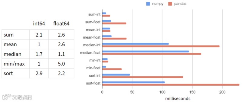 我在Pandas的典型工作负载上对NumPy和Pandas进行了基准测试:5-100列,10³- 10⁸行,整数和浮点数。下面是1行和1亿行的结果: