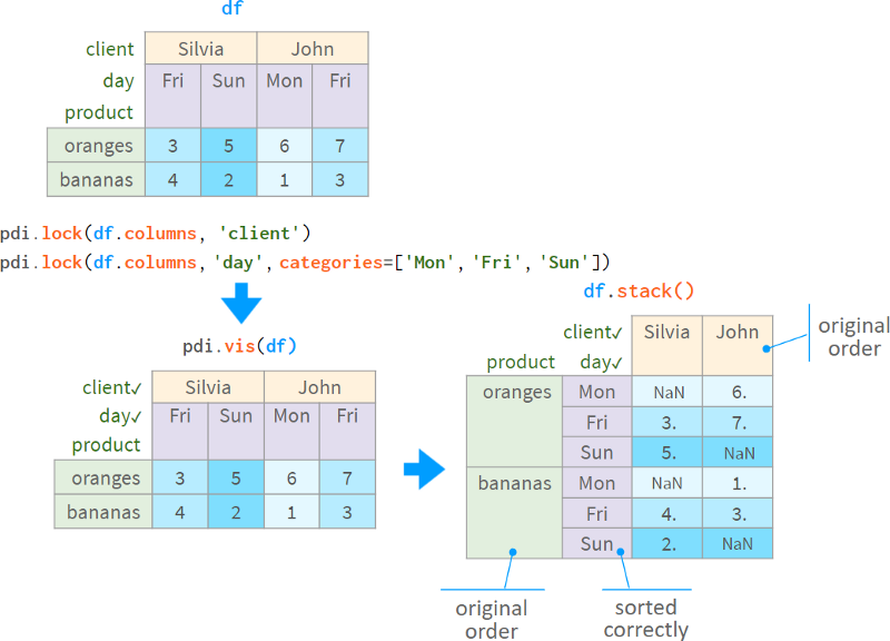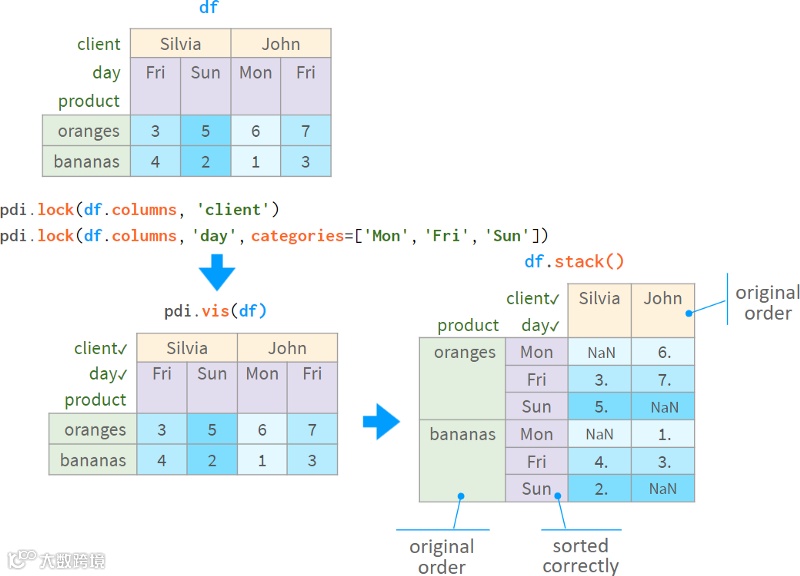 例如,要告诉Pandas锁定存储产品的简单索引的顺序(如果你决定将一周中的天数解栈回列,则不可避免地会排序),你需要编写像df这样可怕的代码。index = pd.CategoricalIndex(df. index)df指数。指数排序= True)。它更适合多索引。