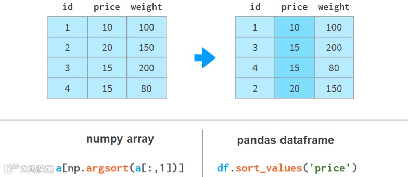 这里argsort(a[:,1])计算使a的第二列按升序排序的排列,然后a[…]相应地对a的行重新排序。Pandas可以一步完成。