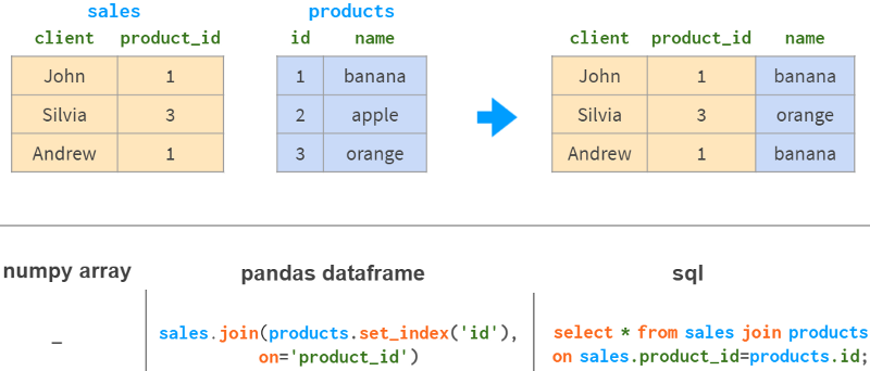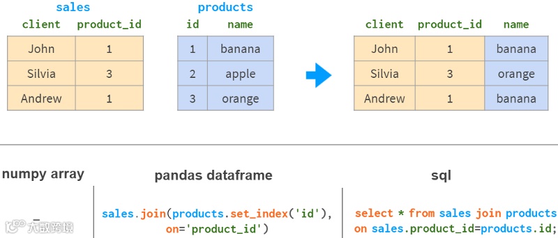 如果你想从另一张表中获取基于同一列的信息,NumPy几乎没有任何帮助。Pandas更好,特别是对于1:n的关系。