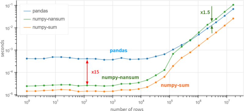 对于超过100万个元素的数组,Pandas的速度是NumPy的1.5倍。对于较小的数组,它仍然比NumPy慢15倍,但通常情况下,无论操作在0.5 ms还是0.05 ms内完成都没有太大关系——无论如何它都是快速的。