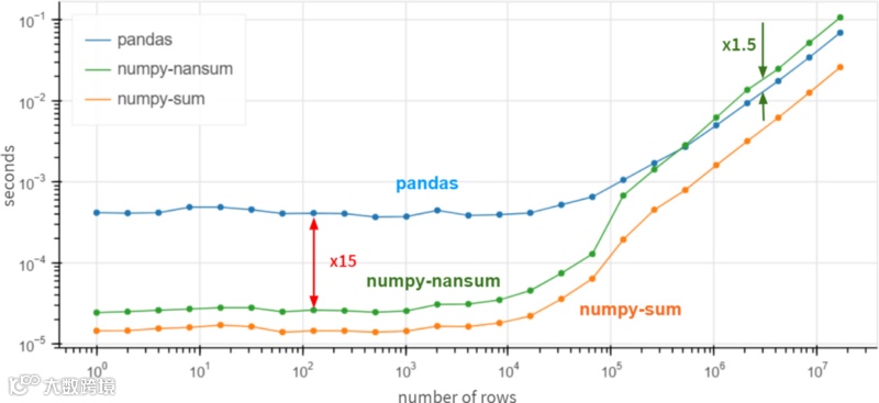 怎么可能呢?也许是时候提交一个功能请求,建议Pandas通过df.column.values.sum()重新实现df.column.sum()了?这里的values属性提供了访问底层NumPy数组的方法,性能提升了3 ~ 30倍。