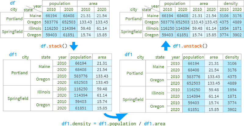 您还可以通过名称或位置索引指定要堆叠/解堆叠的级别。在这个例子中,df.stack()、df.stack(1)和df.stack(' year ')与df1.unstack()、df1.unstack(2)和df1.unstack(' year ')产生相同的结果。目的地总是在“最后一层之后”,并且不可配置。如果需要将级别放在其他地方,可以使用df.swaplevel().sort_index()或pdi。swap_level (df = True)