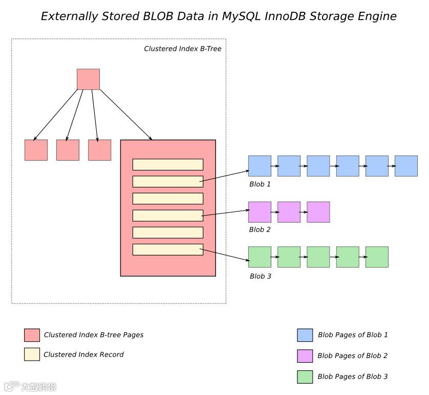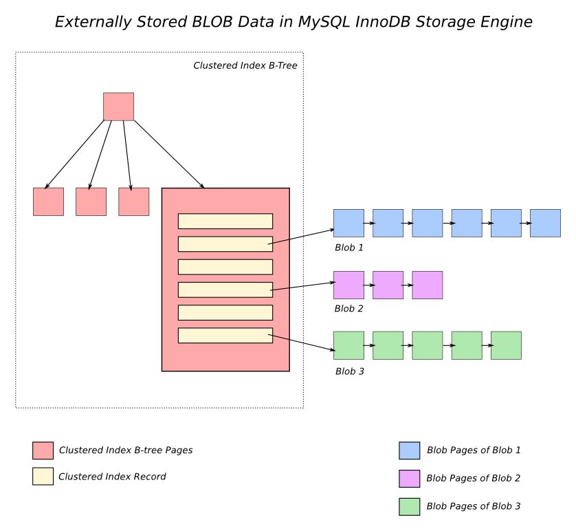 Postgres 使用 TOAST,这是一个专用的影子表(shadow table)存储。当行和列被选中时,大型对象就会被拉出。换句话说,大量的黑盒不会污染你宝贵的缓存。它还支持对 TOAST 对象的压缩。