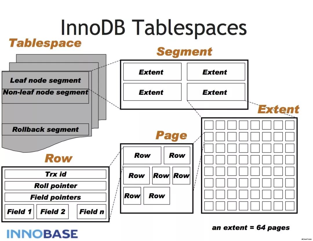 MySQL 的表空间结构与 Oracle 相似,它有多个层次,包括层、区段、页面和行层。
