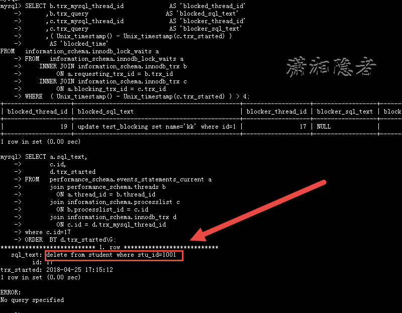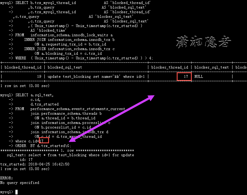 如下截图所示,第一个SQL语句能够查到线程19 被线程 17阻塞了, 被阻塞的SQL语句为“update test_blocking set name=’kk’ where id=1;”, 能够查到被阻塞了多长时间,但是无法查到源头SQL语句。此时就需要第二个SQL语句登场,找到源头语句。