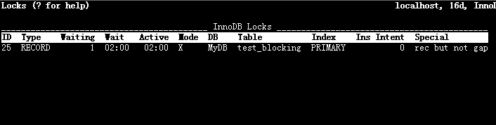 RECORD LOCKS space id 337 page no 3 n bits 72 index `PRIMARY` of table `MyDB`.`test_blocking` trx id 148279 lock_mode X locks rec but not gap waiting