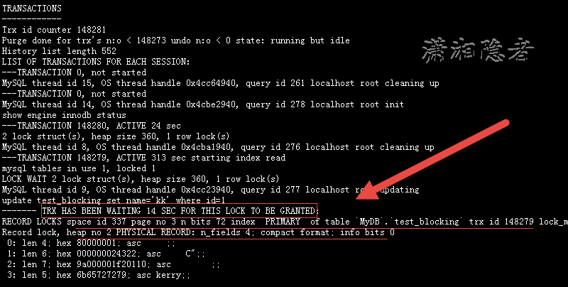 通过那部分信息,我们可以看到update test_blocking set name=’kk’ where id=1这个SQL语句被阻塞了14秒,一直在等待获取X Lock。