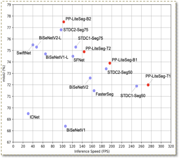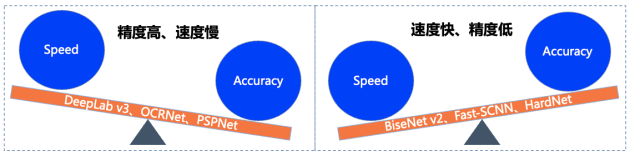 正因如此,DeepLabv3、OCRNet、BiseNetv2、Fast-SCNN等优秀算法层出不穷,然而在实际产业落地过程中往往需要综合考虑硬件性能、精度等多方面因素,对算法的需求也是苛刻的。往往业界算法在保障高识别精度的情况下,就会牺牲算法运行速度;反之追求速度,则会带来精度的大幅度损失。