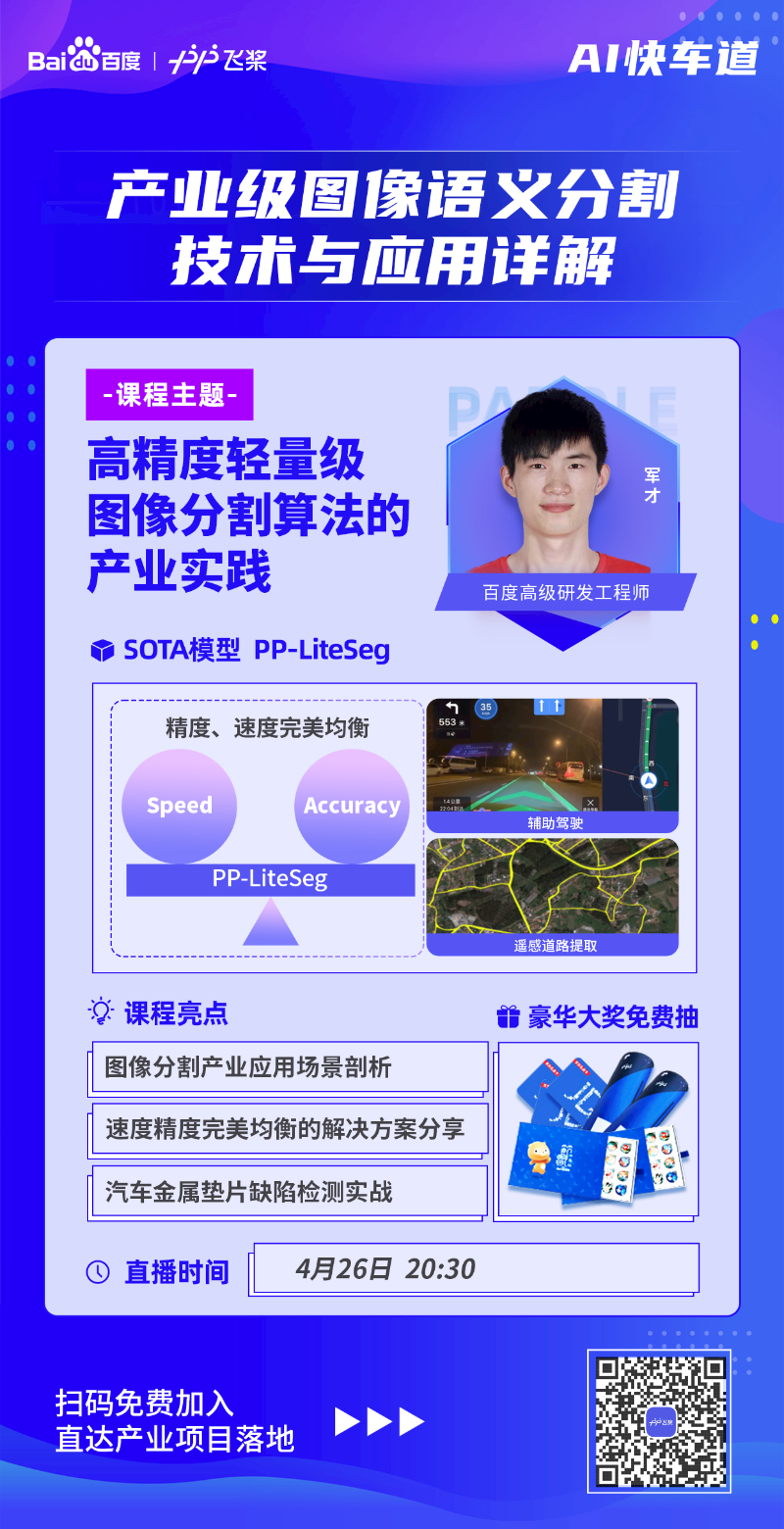 为了让开发者们更深入的了解PP-LiteSeg这个SOTA模型,解决落地应用难点,掌握产业实践的核心能力,飞桨团队精心准备了精品直播课!