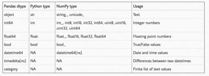 pandas中最糟糕也是最耗内存的数据类型是 object,这也恰好限制了 Pandas 的一些功能。剩下的我们还有浮点数和整数。以下这张表是pandas的所有类型: