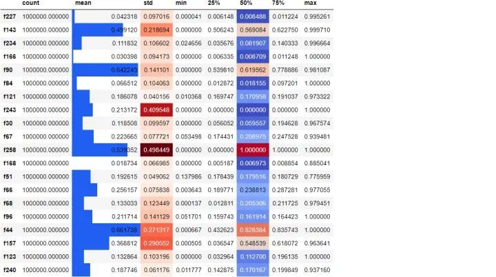我们随机选择 20 列,为它们创建一个 5 位数的汇总,并转置结果,根据它们的大小为均值、标准差和中值列着色。添加这样的样式可以让我们更轻松地发现原始数字中的模式,设置无需使用其他的可视化库。