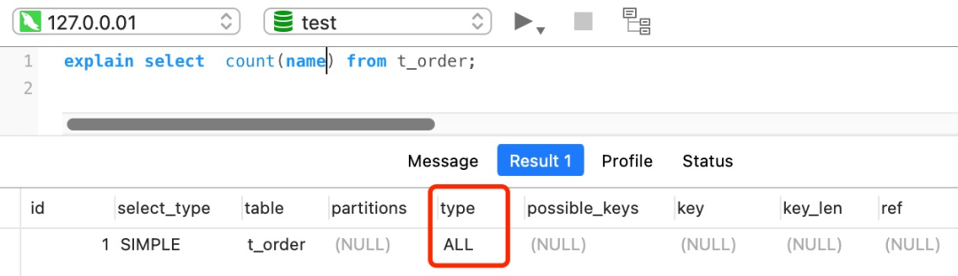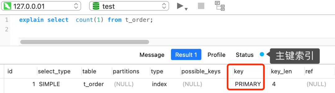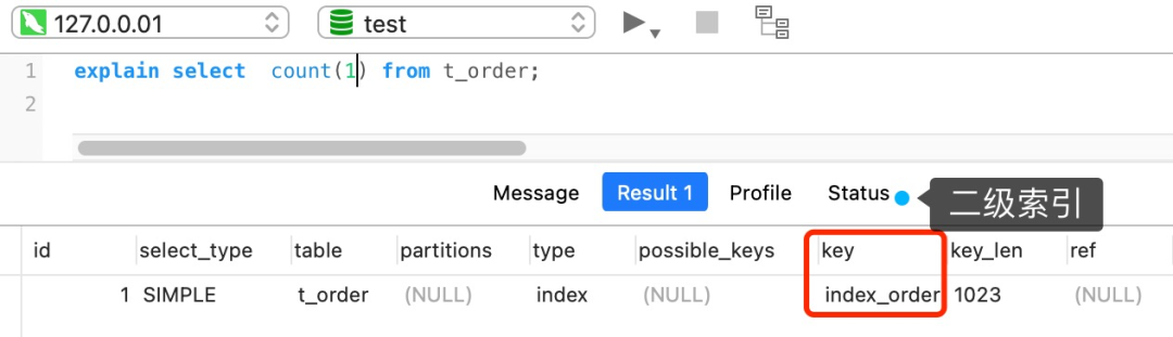 执行 explain 命令效率是很高的,因为它并不会真正的去查询,下图中的 rows 字段值就是 explain 命令对表 t_order 记录的估算值。