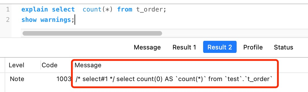 翻译:InnoDB以相同的方式处理SELECT COUNT(*)和SELECT COUNT(1)操作,没有性能差异。