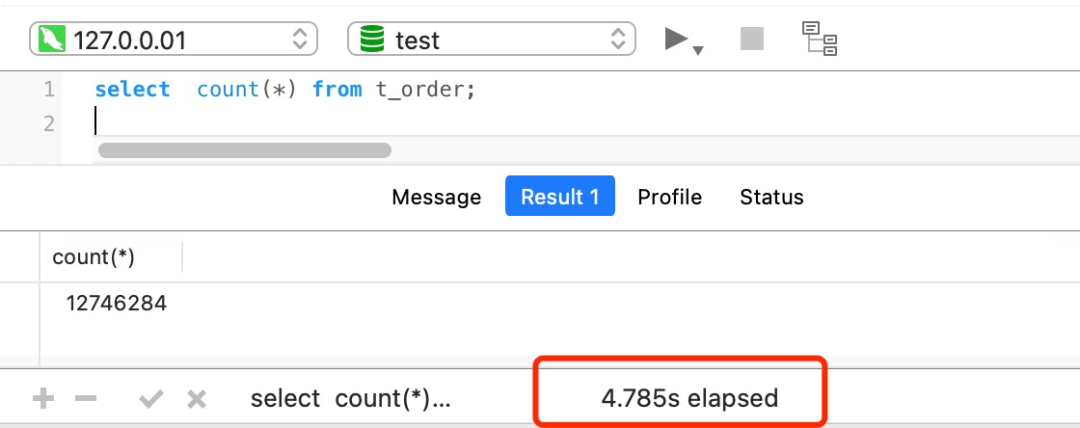 比如下面我这个案例,表 t_order 共有 1200+ 万条记录,我也创建了二级索引,但是执行一次 select count(*) from t_order 要花费差不多 5 秒!